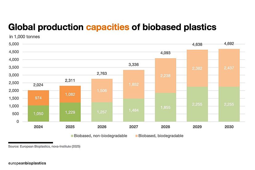 Laut dem Bericht «Bioplastics Market Development Update 2025» soll die globale Produktionskapazität biobasierter Kunststoffe von 2.31 Millionen Tonnen im Jahr 2025 auf 4.69 Millionen Tonnen im Jahr 2030 ansteigen. Biobasierte Kunststoffe haben derzeit einen Anteil von 0.5 Prozent an der globalen Kunststoffproduktion von 431 Millionen Tonnen.